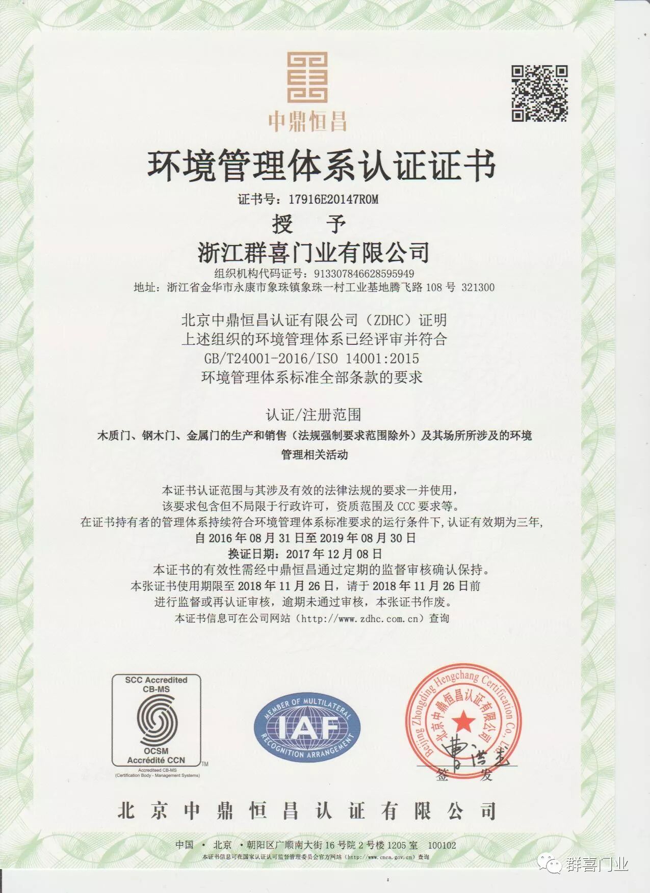 随着群喜门业业务的不断扩大,为了适应发展的需要,与国际接轨。2017年,各部门在公司领导层组织和带领下,认真学习ISO9001:2015、ISO14001:2015体系新标准,依据新版标准完善质量、环境管理体系,同时进一步规范内部管理,按照OHSAS18001:2007标准要求建立职业健康安全管理体系。