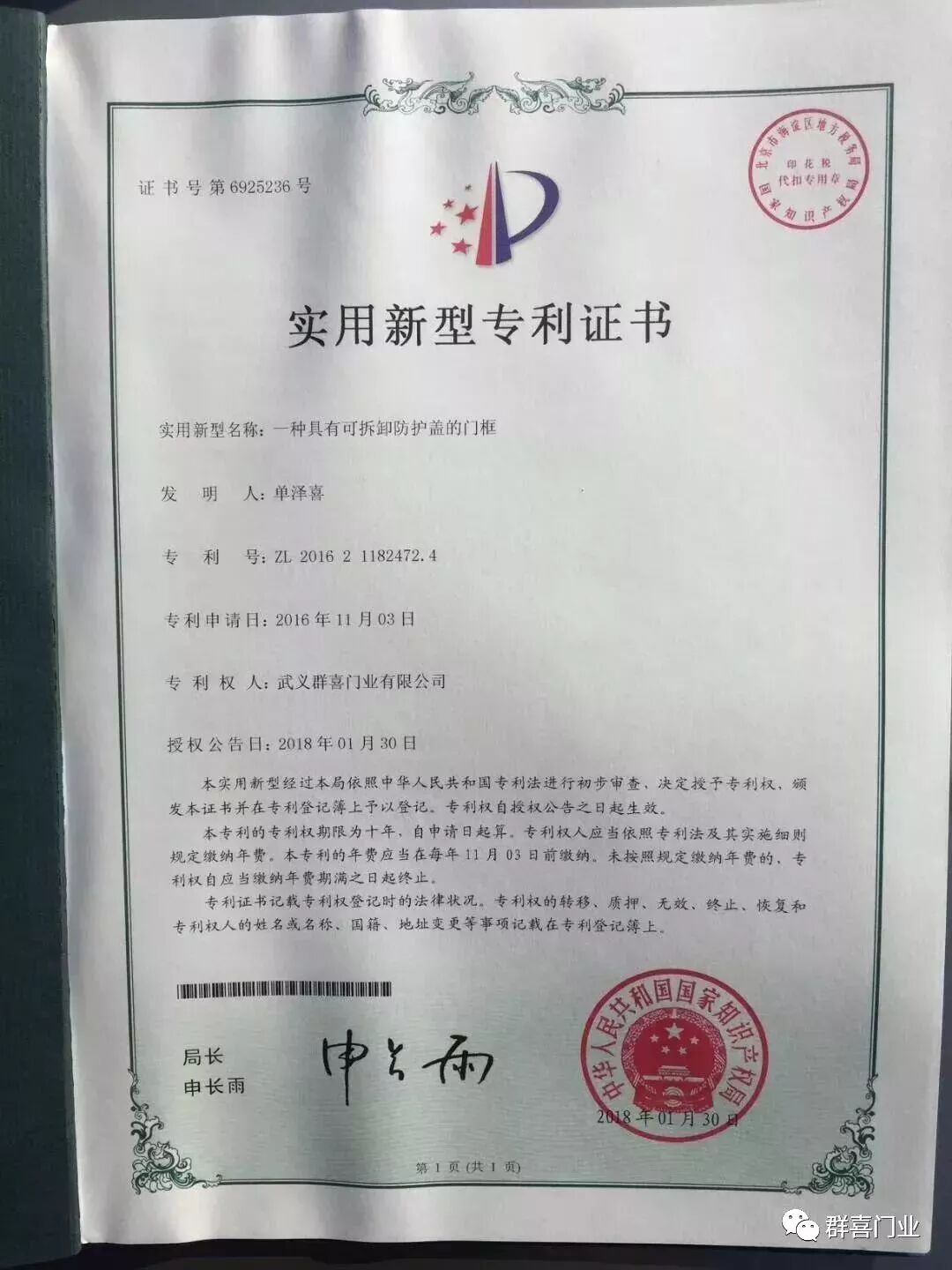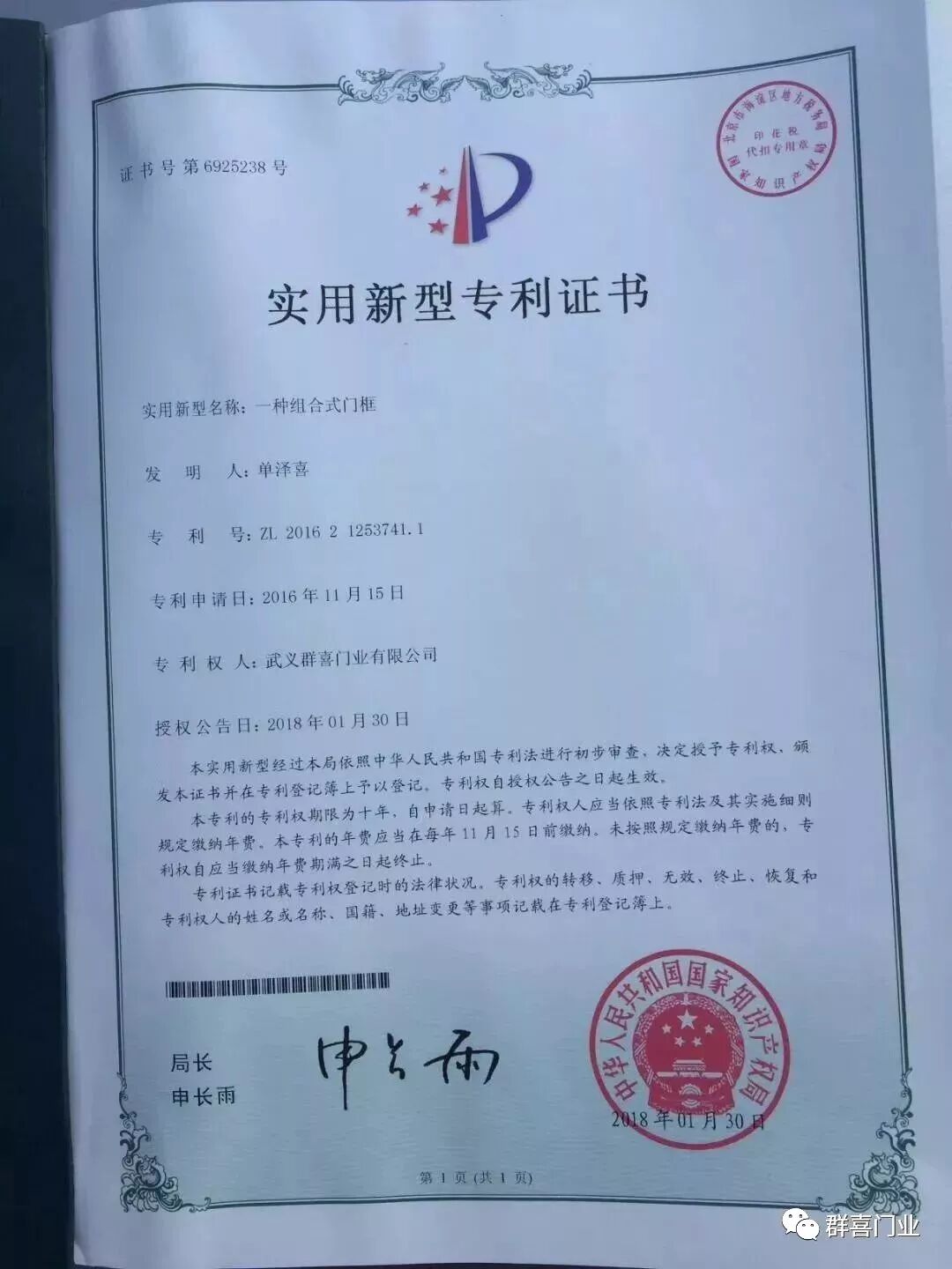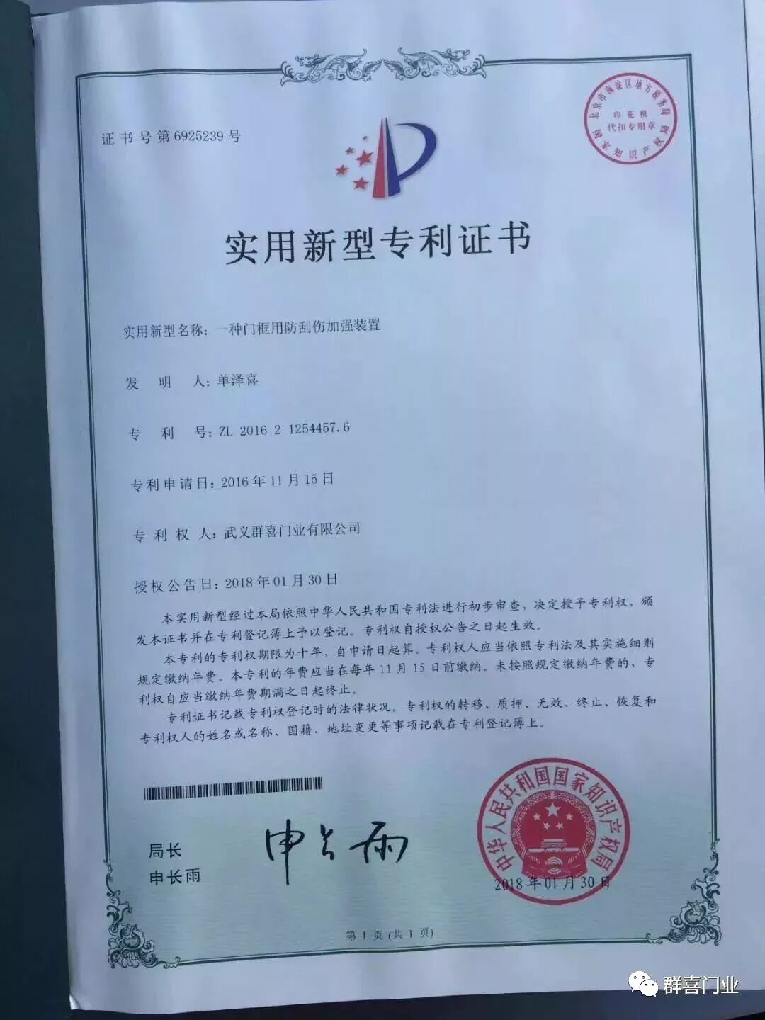 ▲祝贺群喜门业成功获得多项实用新型专利证书