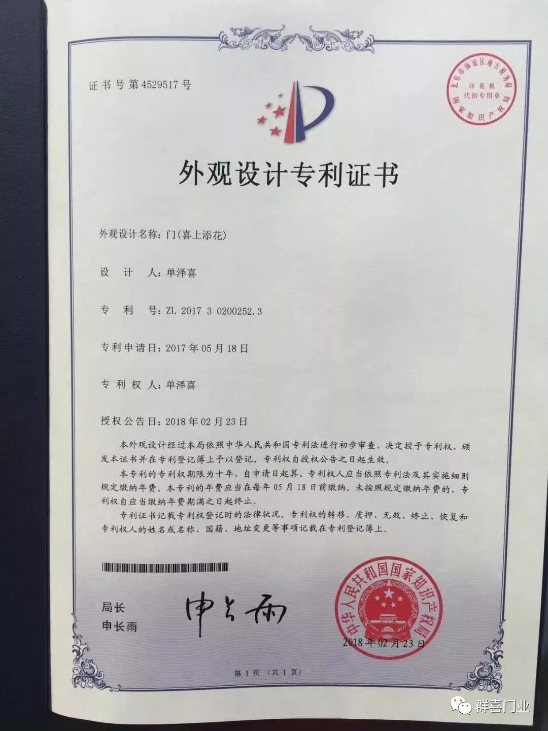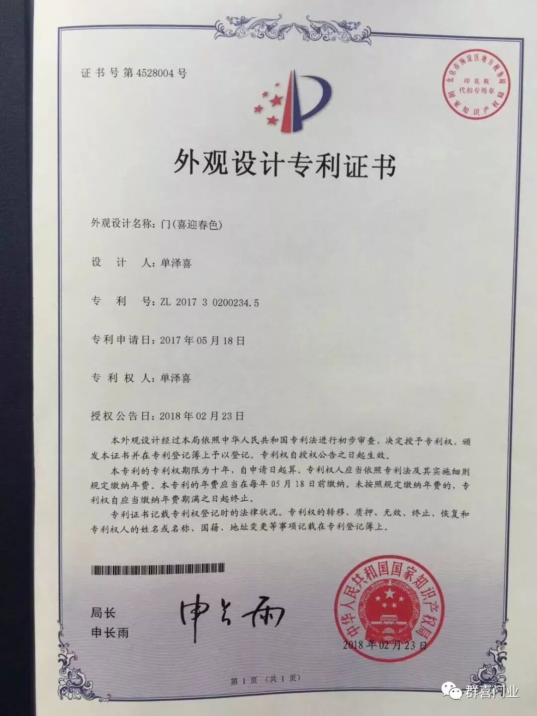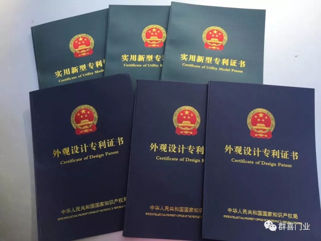 ▲祝贺群喜门业成功获得多项外观设计专利证书
