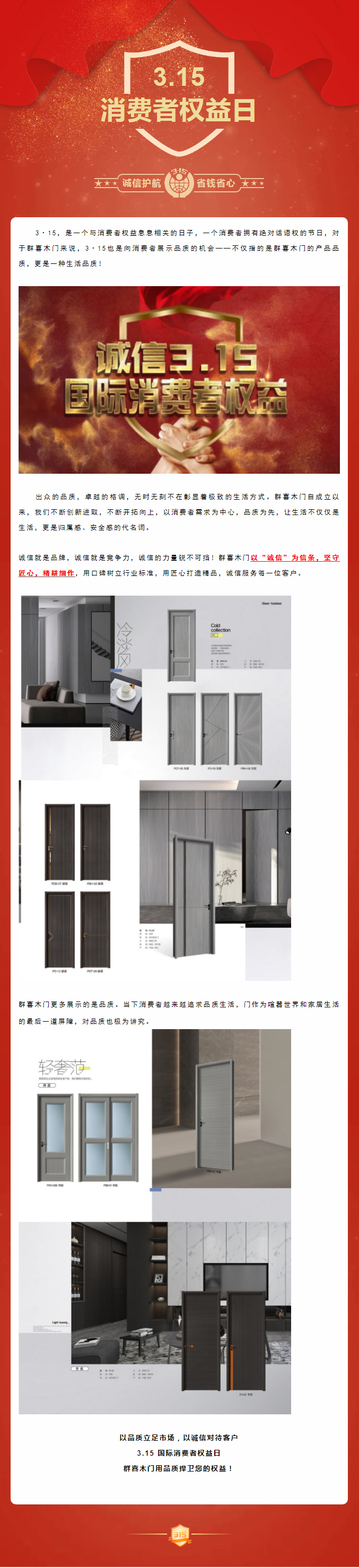 315,是一个与消费者权益息息相关的日子,一个消费者拥有绝对话语权的节日,对于群喜木门来说,315也是向消费者展示品质的机会——不仅指的是群喜木门的产品品质,更是一种生活品质!出众的品质,卓越的格调,无时无刻不在彰显着极致的生活方式。群喜木门自成立以来,我们…
